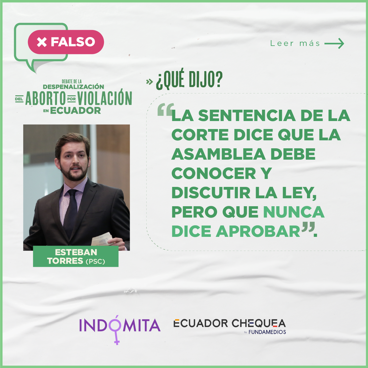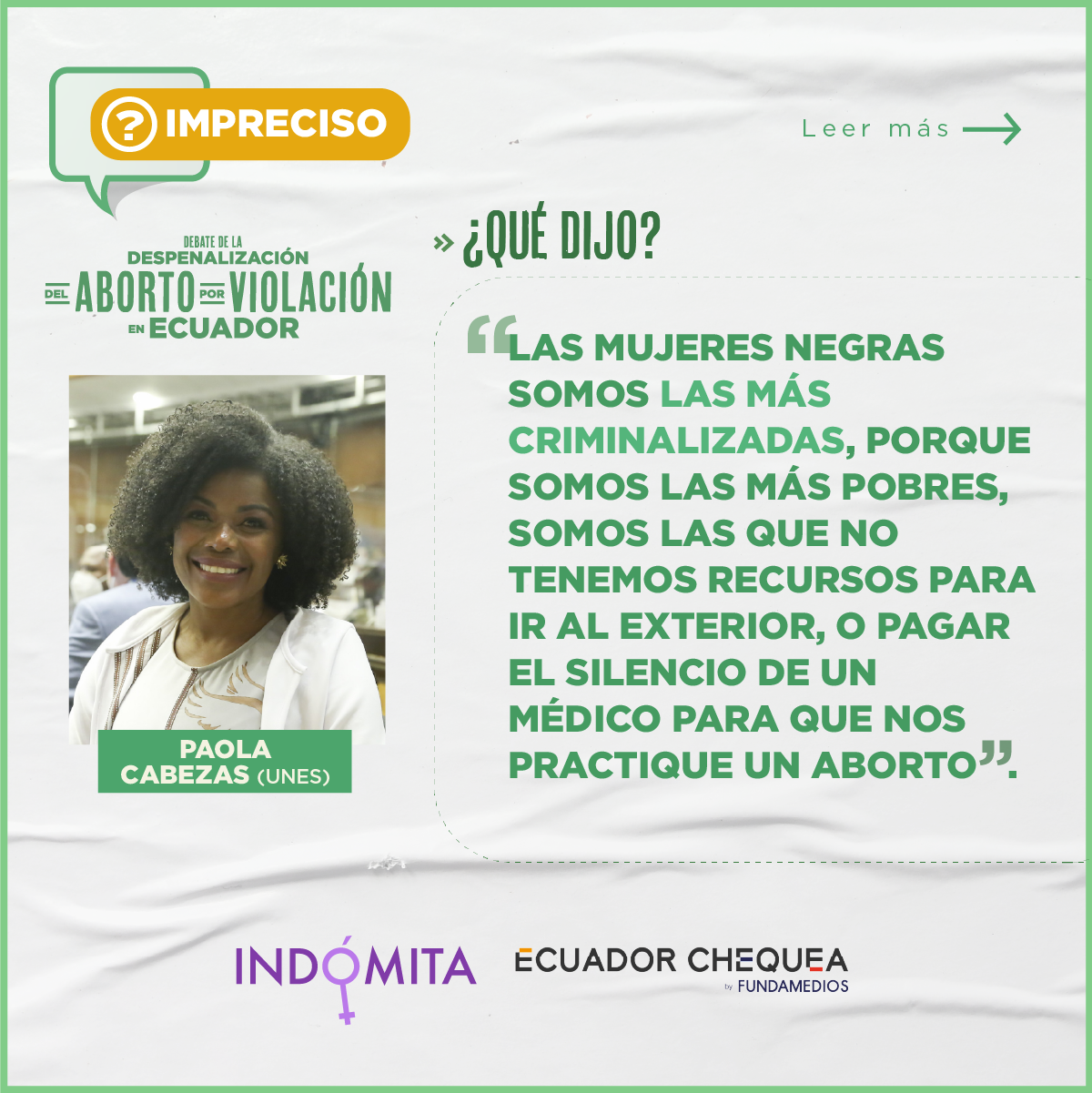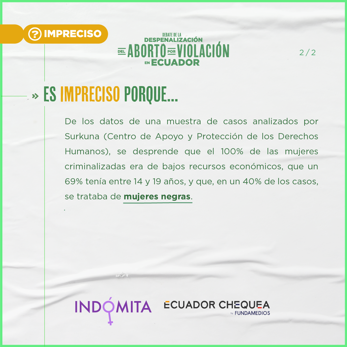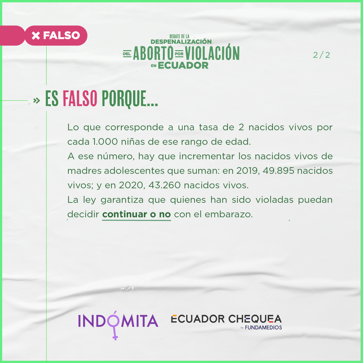 Durante esta continuación del segundo debate, Indómita y Ecuador Chequea realizaron el chequeo en vivo del discurso de los asambleístas. Este trabajo tuvo el respaldo de Cepam Guayaquil y los siguientes medios y coaliciones: Plan V, GK, La Barra Espaciadora, Chicas Poderosas Ecuador, Primicias, Wambra Radio, BN Periodismo, La Periódica, Tinta Digital, Ecuador Verifica, Ecuador Today y Edición 111.