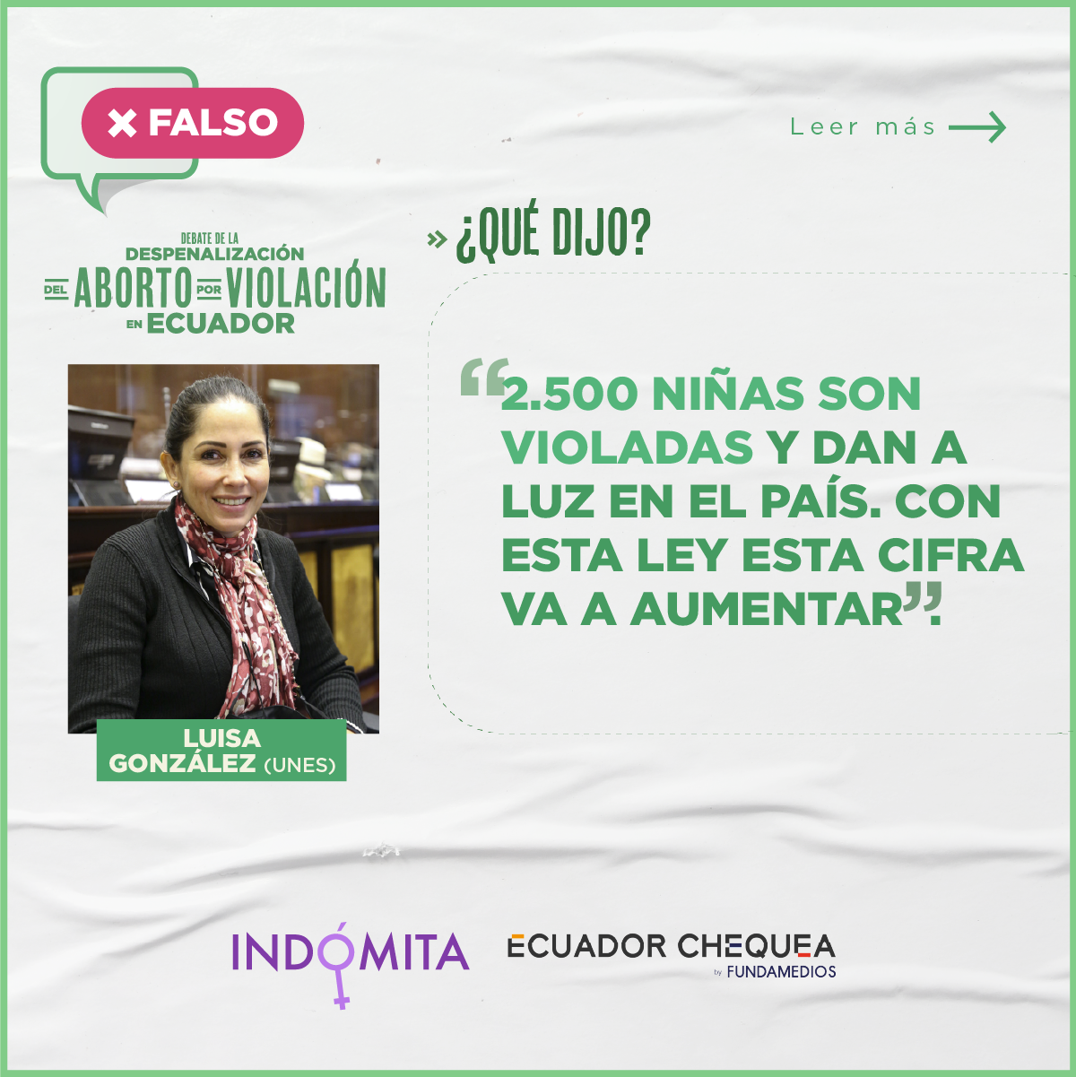 Las y los legisladores que se oponen al proyecto de Ley trataron de llevar el debate hacia aspectos que no tienen relación con lo que se busca normar, el procedimiento para acceder al aborto por violación. Así, cuestionaron que el segundo informe no incluya la obligación de la denuncia por parte de la afectada por la violación, lo que significaría —dijeron— que el violador quede sin sanción, en la impunidad. Así lo mencionó, por ejemplo, Luisa González (UNES), quien manifestó que se pretende dejar al agresor en libertad, inclusive para que vuelva a delinquir. Sin embargo, de acuerdo con la verificación realizada por Ecuador Chequea y el medio digital Indómita, se trata de una declaración falsa, pues la violación está ya tipificada en el Código Orgánico Integral Penal (COIP). Algo que Gruber Zambrano (independiente) le recordó a González, mencionando que la sanción tiene su propio procedimiento en esa Ley.
