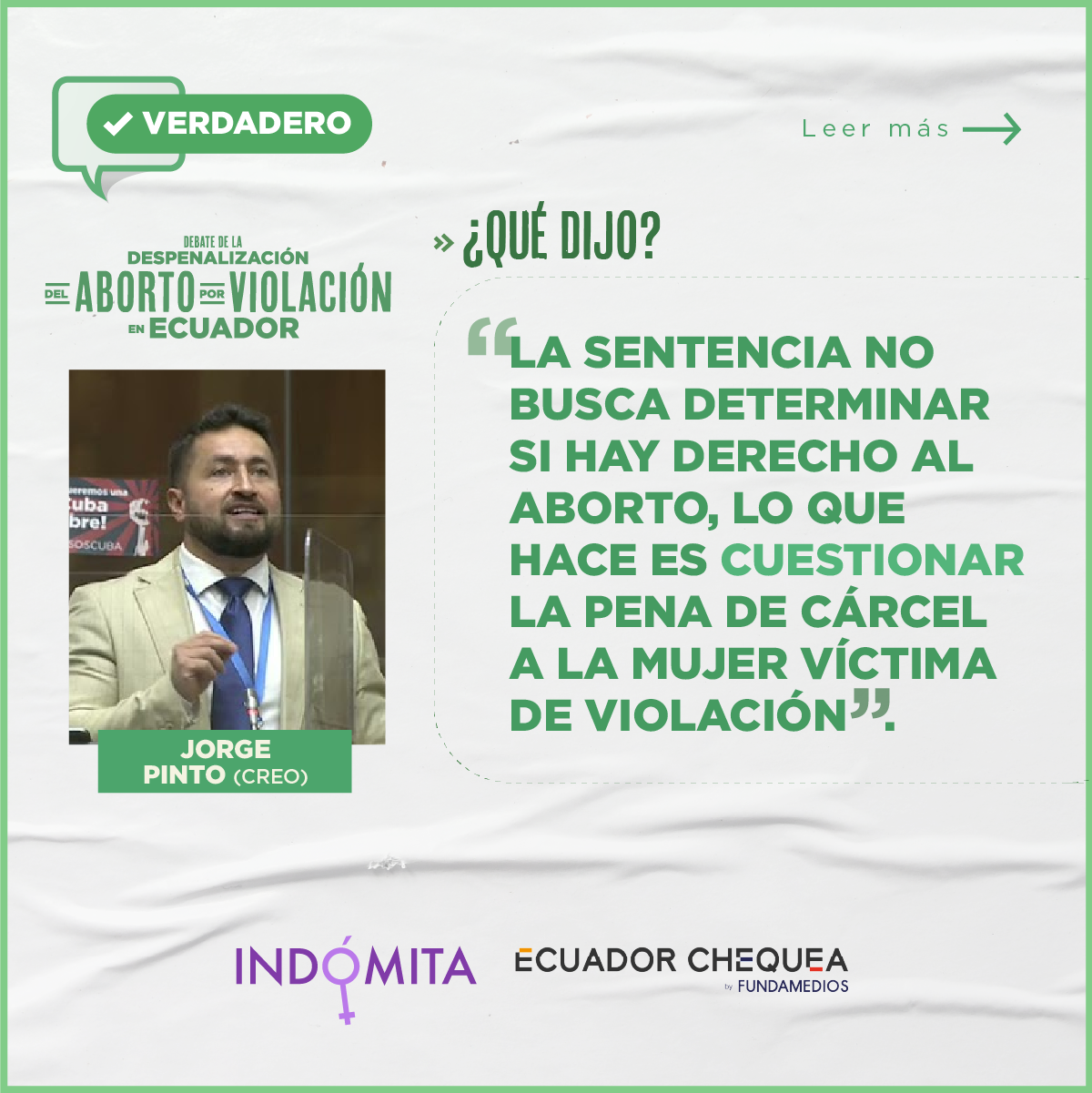 Jorge Pinto (CREO): “La sentencia no busca determinar si hay derecho al aborto, lo que hace es cuestionar la pena de cárcel a la mujer víctima de violación”.