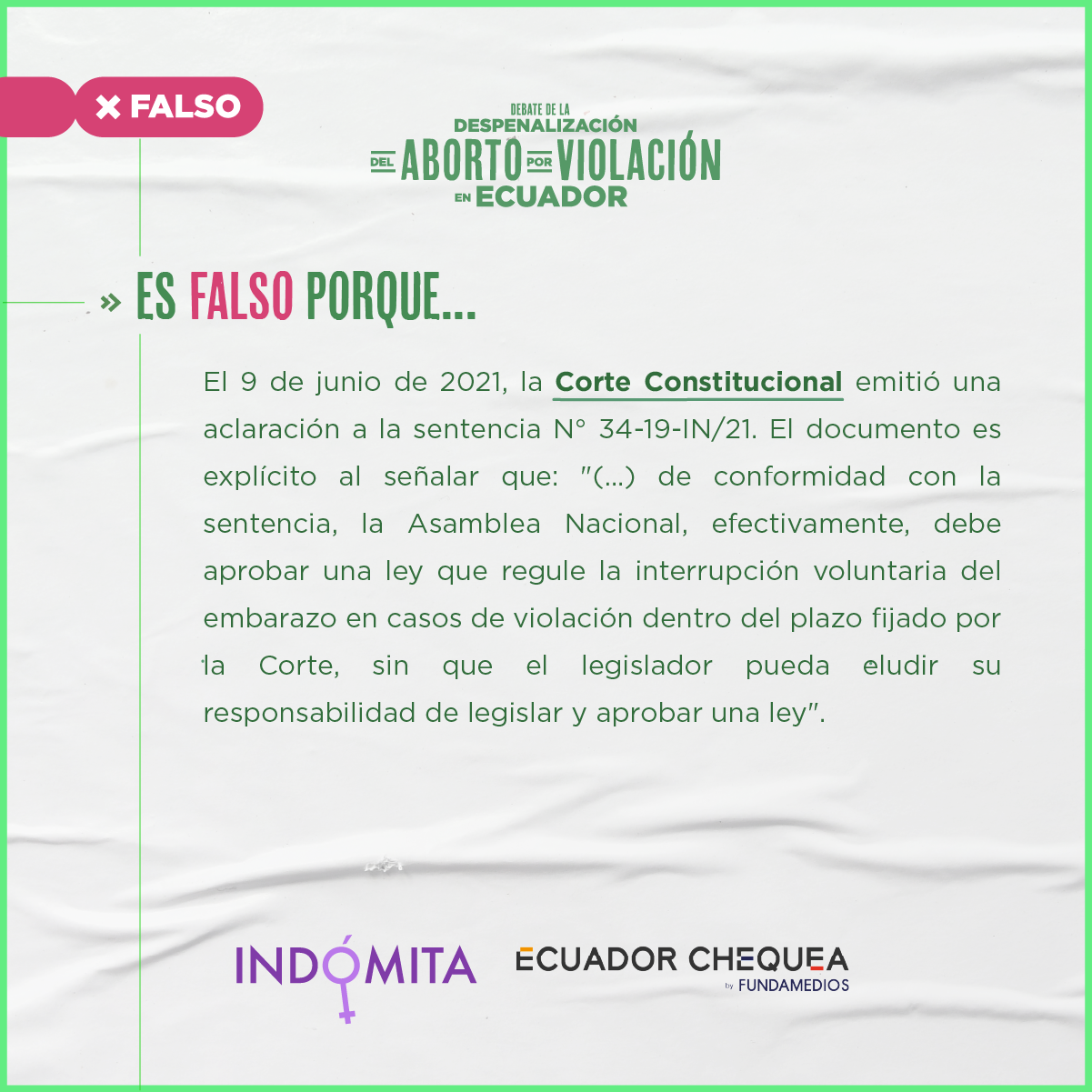 La Corte Constitucional tampoco se salvó de sus críticas. Según argumentos de legisladores como Vanessa Freire y Pedro Velasco (independientes), este organismo se excedió en sus competencias al ordenar a Asamblea que elabore un proyecto de Ley que norme el procedimiento. “Tenemos nueve dioses, dioses del Olimpo”, ironizó Cesar Rohon (independiente), mientras que el socialcristiano Esteban Torres aseguró que la sentencia mandaba conocer y discutir la Ley, pero no aprobarla, y que no sería cómplice de aprobación de esta Ley ya que el aborto es un “negocio para la comercialización de los tejidos de los fetos”. Esto, pese a que existe una aclaración de la Corte Constitucional que dice explícitamente que se debe aprobar la Ley, tal como lo recordó el fact-checking realizado entre Ecuador Chequea e Indómita.